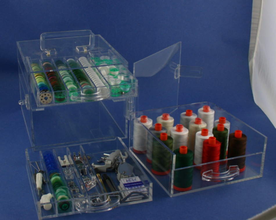Clear Acrylic Bobbins and Thread Holder same as Sew102 except this display has 3 removable trays. The top 2 drawers have dividers to keep thread in place. Bottom drawer has no dividers.