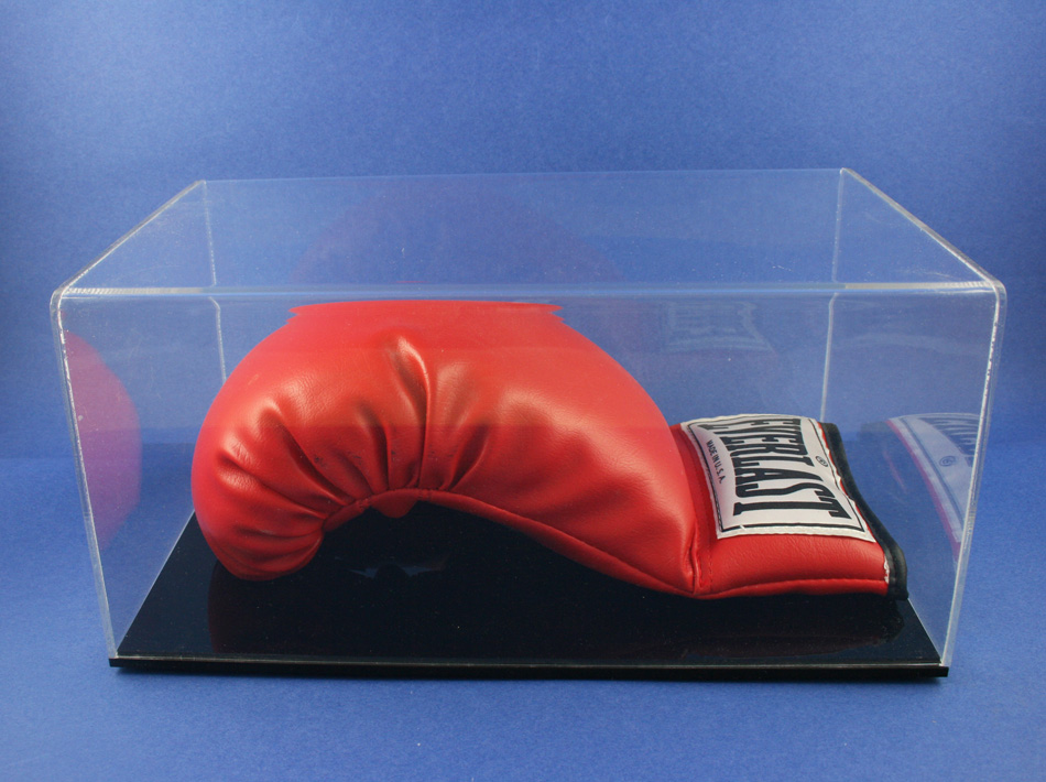 Here is a BOXING GLOVE DISPLAY for a single glove. The top is made with 1/8 Clear Acrylic. The base is a combination of 3/16 and 1/8 Black Acrylic. The size of the BOXING GLOVE DISPLAY is 13" wide x 8" deep x 6" tall.
