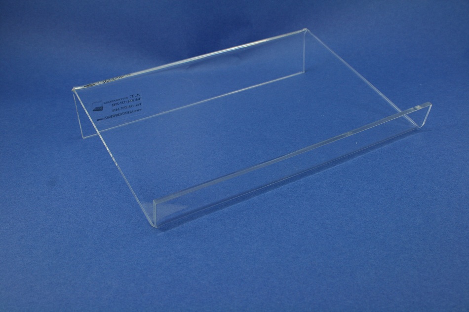 The material is 3/16 Clear Acrylic. The size is 10" wide x 7" tall face. The back rises 2" and the front lip is 1" tall.