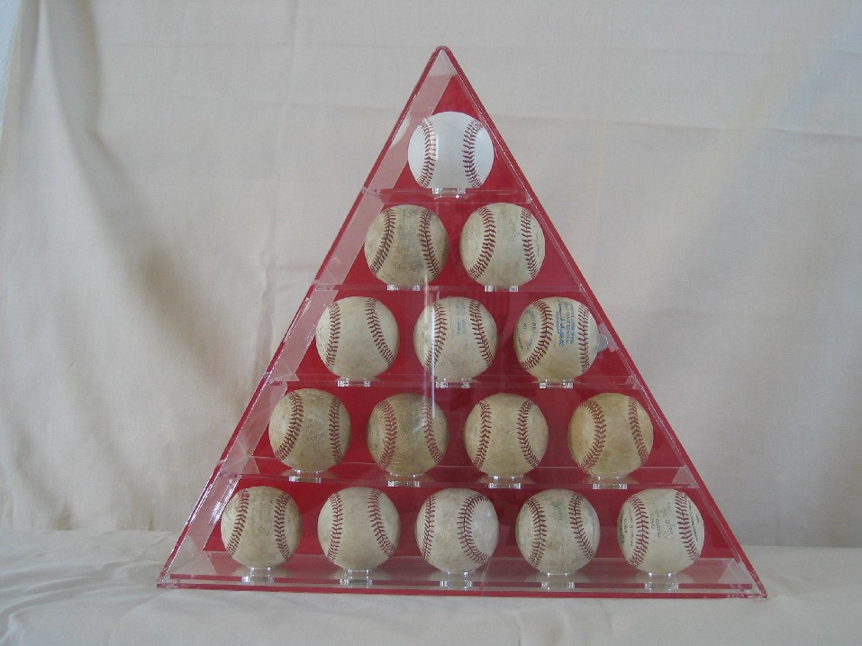 Looking for a Unique BASEBALL DISPLAY? This BASEBALL DISPLAY holds 15 baseballs. The display is made with clear acrylic front,sides,and shelves. The back is a hinged door with a keyed lock . The back as shown is Red Acrylic but other colors(white,blue,black or clear) are available.