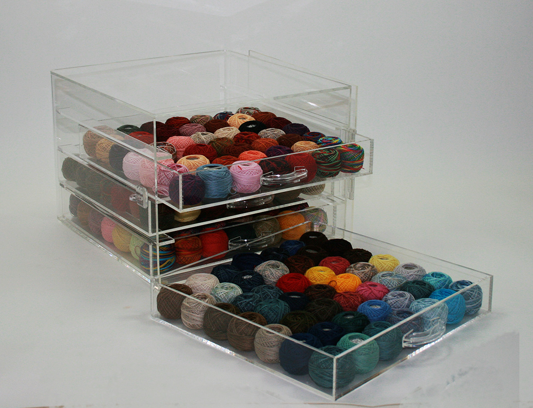 This Acrylic Thread Organizer is the same as the 8-draw organizer with only 4 trays. The trays are the same size as the 8-draw organizer and hold approximately 49 rolls of Valdani, DMC, Presencia Pearl and Cotton to name a few .